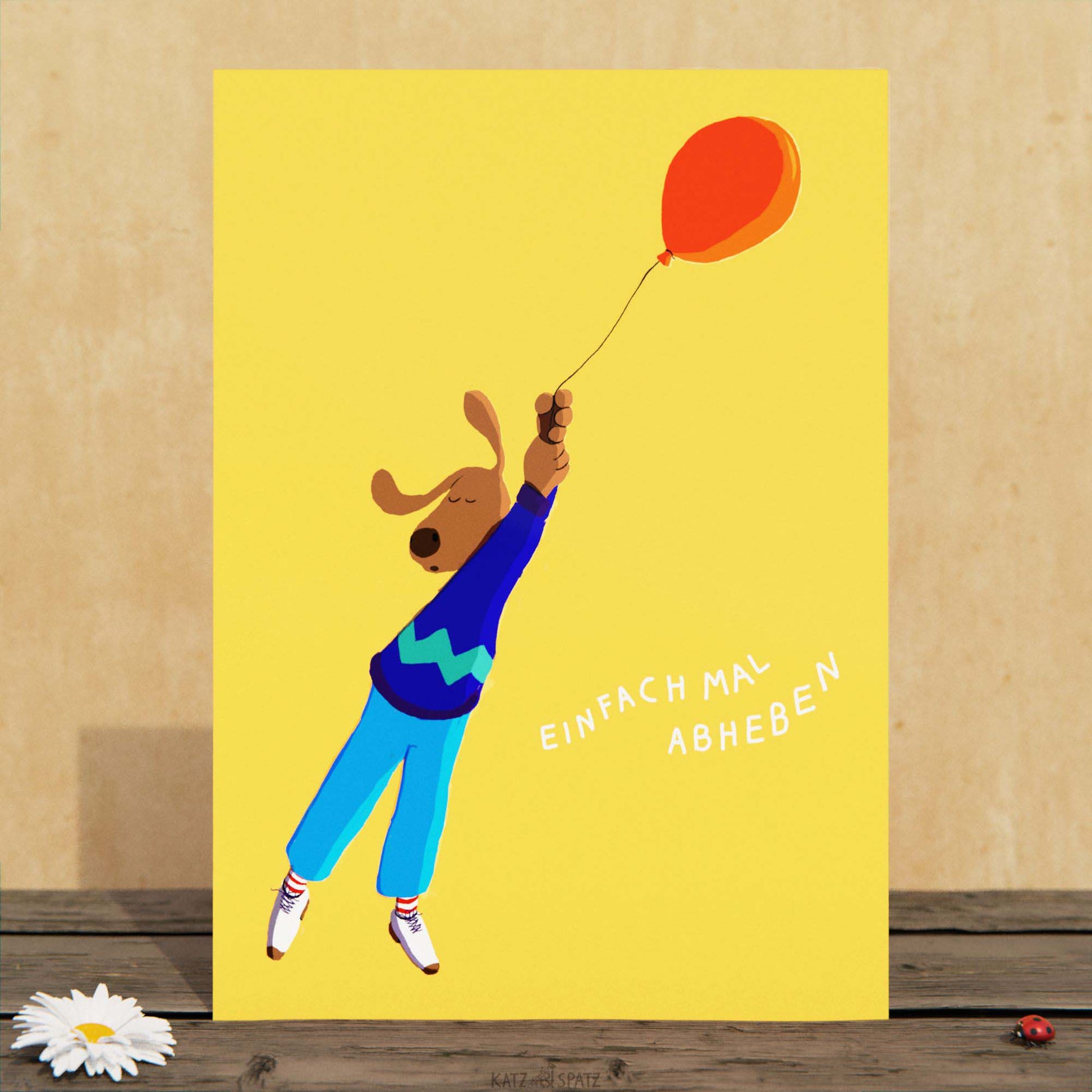 erschenke einen kleinen Höhenflug mit dieser fröhlichen Postkarte – perfekt für alle, die gerne träumen und ab und zu den Boden unter den Füßen verlieren! Ein entspannter Hund schwebt mit geschlossenen Augen und einem roten Luftballon in der Hand durch den gelben Himmel. „Einfach mal abheben“ und dem Alltag für einen Moment entfliehen.
