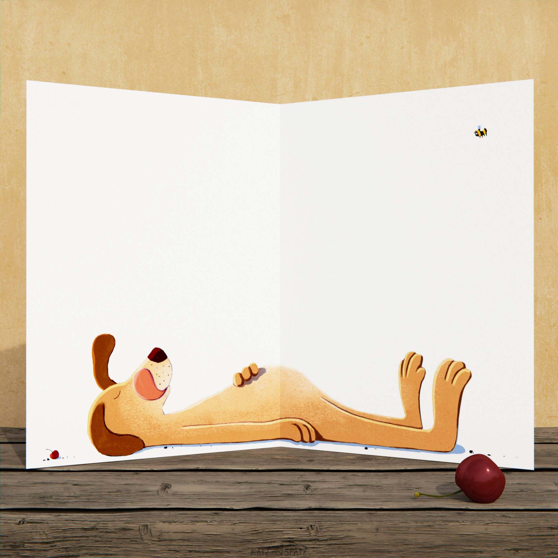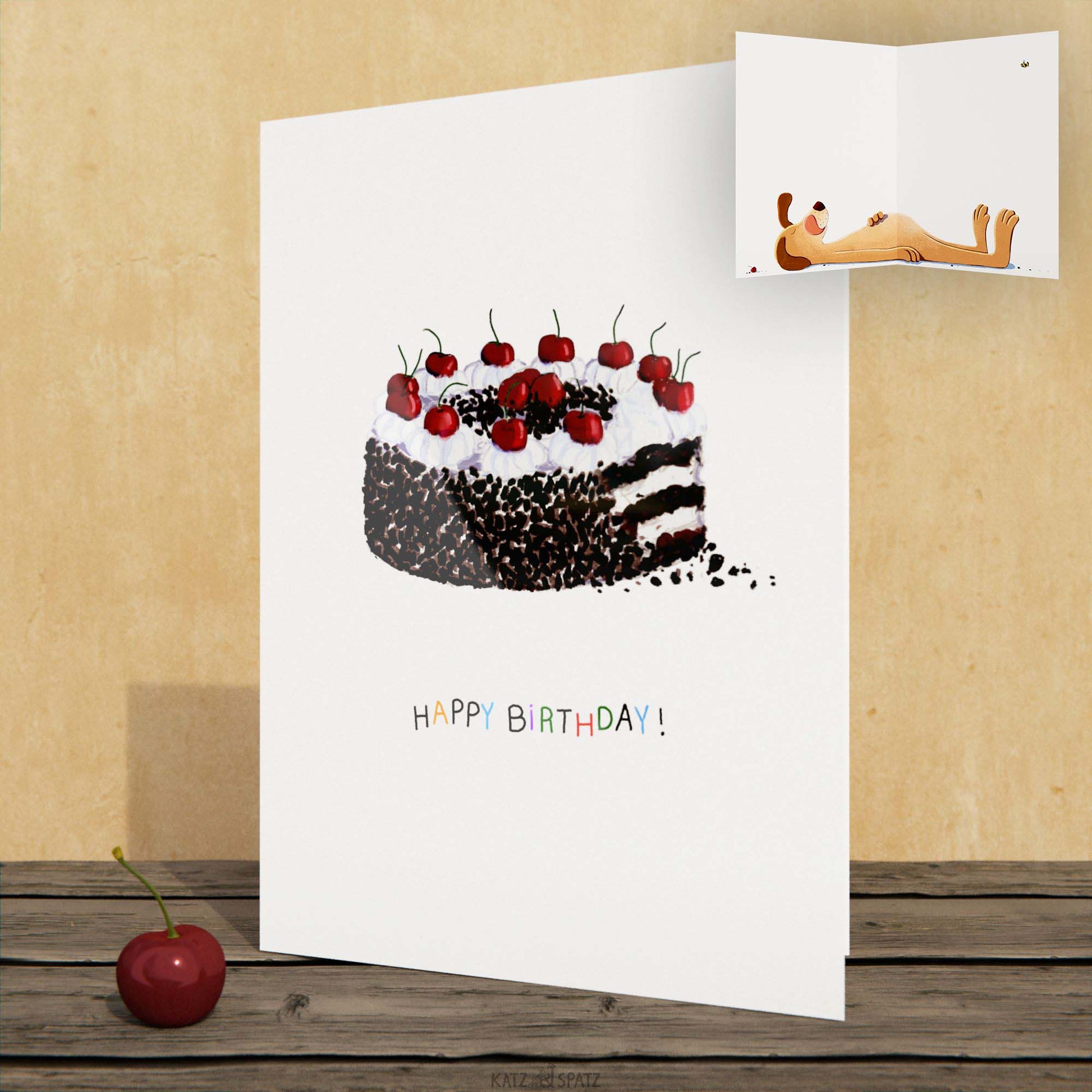 Diese fröhliche Klappkarte bringt Geburtstagsgrüße zum Schmunzeln! Auf der Vorderseite thront eine köstliche Schwarzwälder Kirschtorte mit Sahne und Kirschen – darunter ein buntes „Happy Birthday!“. Im Innenteil wartet ein relaxter Hund, der zufrieden vom Kuchen nascht – viel Platz für deine persönlichen Wünsche bleibt trotzdem.